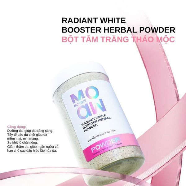 Bột tắm trắng thảo mộc Moaw Moaws giúp dưỡng sáng da body dịu nhẹ, làm sạch mụn và hỗ trợ chống lão hóa. Khám phá công dụng và cách dùng chi tiết tại eHerb.vn.