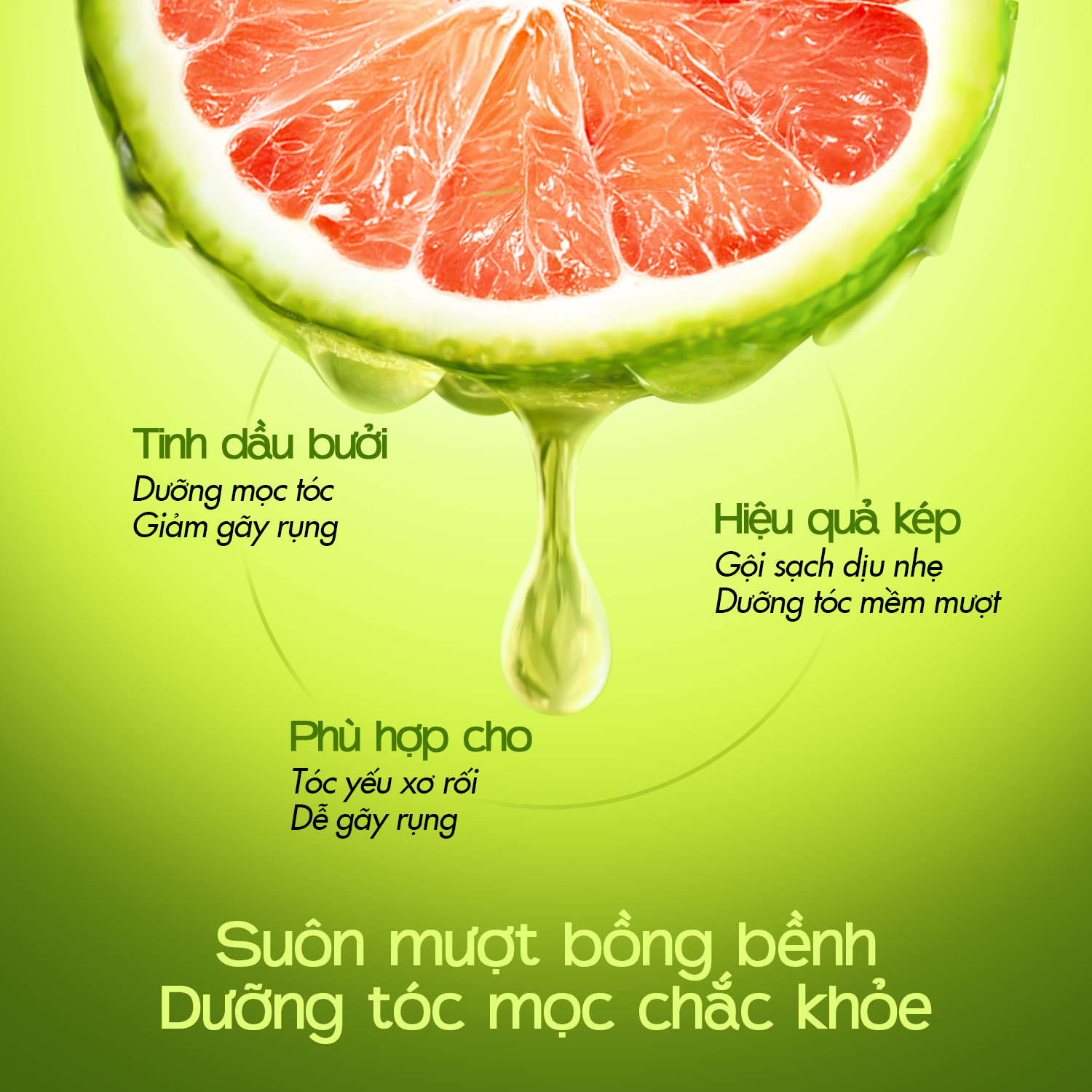 - Ngừa rụng, kích thích mọc tóc : Tinh chất đậm đặc từ tinh dầu Vỏ Bưởi sẽ giúp giải phóng paraben và kích thích sản sinh collagen khiến da đầu và chân tóc trở nên chắc khỏe khiến tóc mới mọc nhanh hơn, kích thích quá trình mọc tóc.