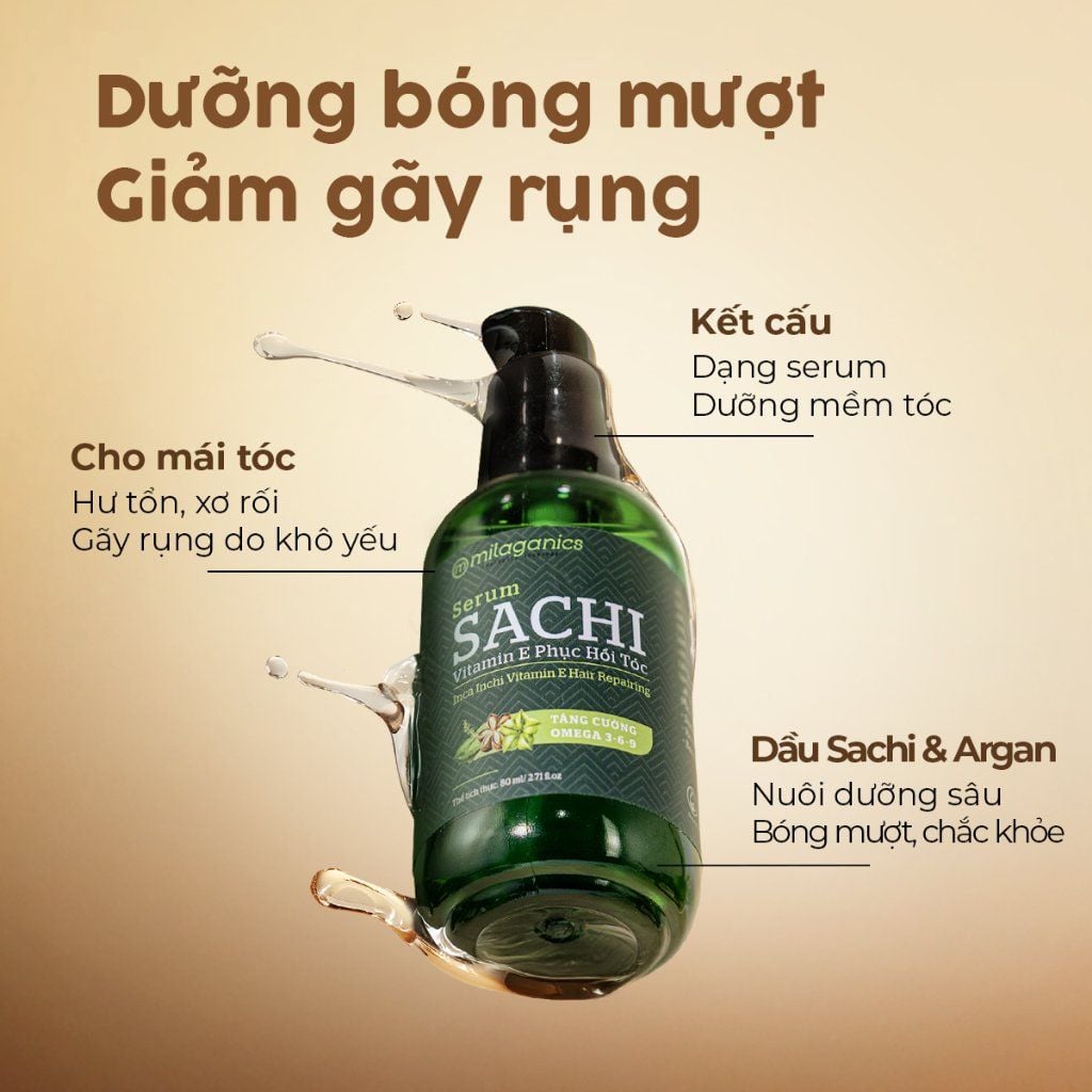 Serum Sachi Phục Hồi Tóc Vitamin E Milaganics chính là sản phẩm không thể thiếu của các cô nàng hiện đại không ngại thay đổi phong cách thông qua mái tóc. Với dầu Sachi 100% nguyên chất, Serum Sachi bổ sung tỉ lệ vàng Omega 3-6-9 giúp tạo lớp màng bảo vệ tóc đến 98% khỏi nhiệt độ cao khi sấy, uốn, duỗi,... và hoá chất tạo kiểu. Bên cạnh đó, Serum còn tăng cường các “thần dược" chống oxy hóa như dầu Dừa, dầu Argan, dầu Hạnh Nhân kết hợp với hàm lượng lớn vitamin E giúp tóc chắc khỏe, giảm khô xơ và mềm mượt tức thì chỉ sau 1 lần sử dụng.