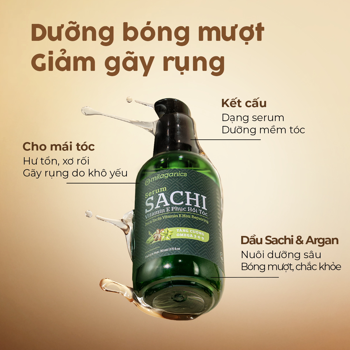 Serum Sachi Phục Hồi Tóc Vitamin E Milaganics chứa các thành phần chăm sóc tóc từ thiên nhiên nổi tiếng như dầu Sachi nguyên chất, hàm lượng lớn vitamin E, dầu Dừa, dầu Argan, dầu Hạnh Nhân,...