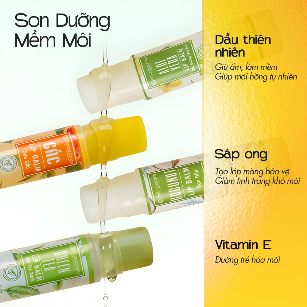 Son dưỡng ẩm có thành phần thiên nhiên, được chiết xuất từ tinh chất lá trà xanh, gấc kết hợp cùng dầu dừa, dầu ô liu, dầu cám gạo, dầu hướng dương, sáp ong, sáp thực vật, …