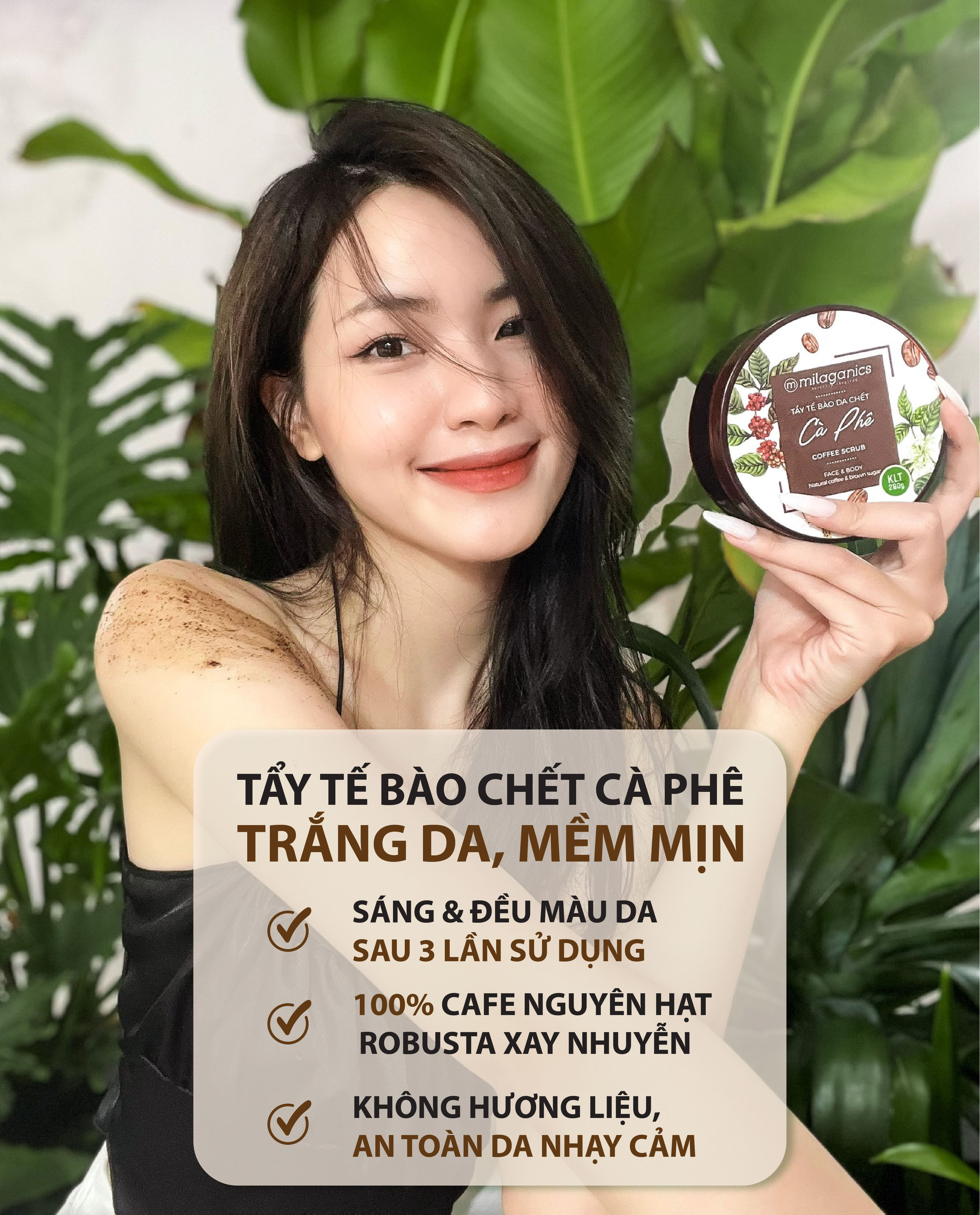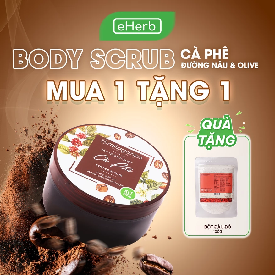Scrub tẩy tế bào chết cà phê Milaganics loại bỏ nhẹ nhàng lớp tế bào chết trên da, đồng thời kích thích sản sinh các tế bào mới nhờ bột cà phê hạt mịn Robusta và đường nâu. Sự kết hợp với các thành phần an toàn, có nguồn gốc 100% từ thiên nhiên như dầu Olive, dầu Cám Gạo, Mật Ong, nước Nha đam cùng Vitamin E, Glycerin giúp dưỡng ẩm và làm da trở nên sáng màu, giảm thâm sạm.