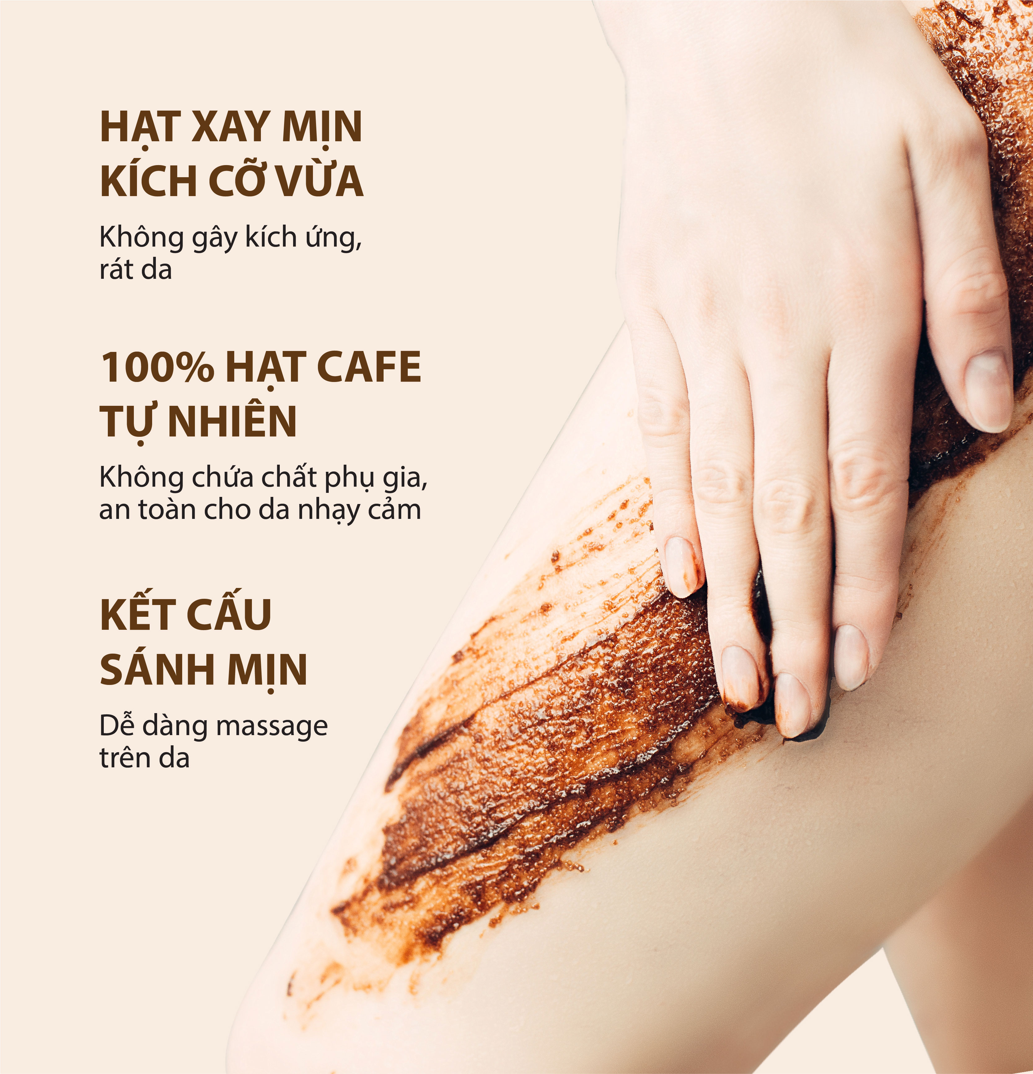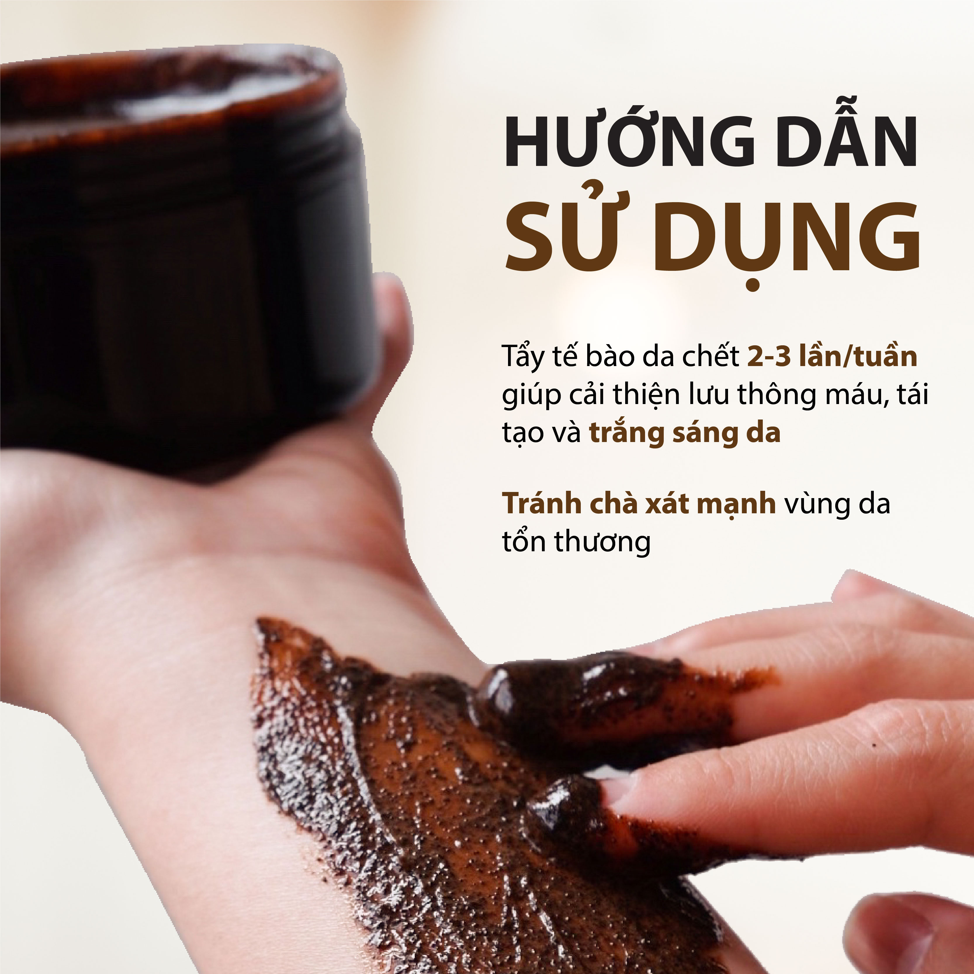 - Tẩy da chết, làm sạch da: Sản phẩm có thành phần chính là bột cà phê hạt mịn Robusta chứa chất caffeine và đường nâu có tác dụng làm sạch da, lấy đi lớp tế bào chết, kích thích sự sản sinh các tế bào mới, khiến da trở nên mịn màng hơn.