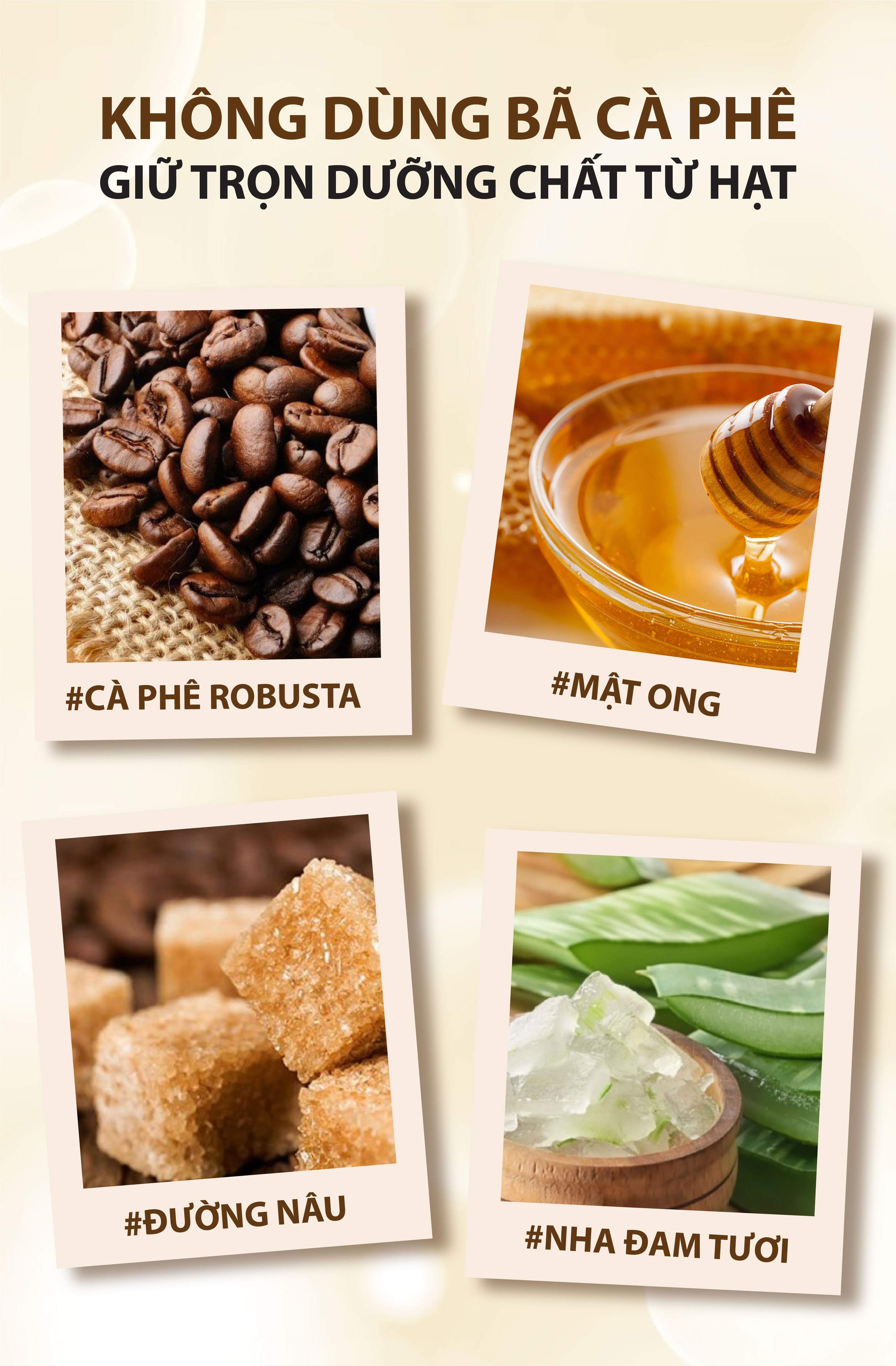 Scrub tẩy tế bào chết cà phê là sự kết hợp của bột cà phê hạt mịn Robusta và đường nâu, đóng vai trò như các hạt massage giúp đẩy đi các tế bào chết và những lớp sừng trên da, làm sạch sâu một cách dịu nhẹ. Đồng thời, khi kết hợp với dầu Olive, dầu Cám Gạo, Mật Ong, Glycerin, bột Yến Mạch và nước Nha Đam sẽ giúp làn da được cấp ẩm vượt trội, trở nên mềm mượt và trắng sáng đều màu.