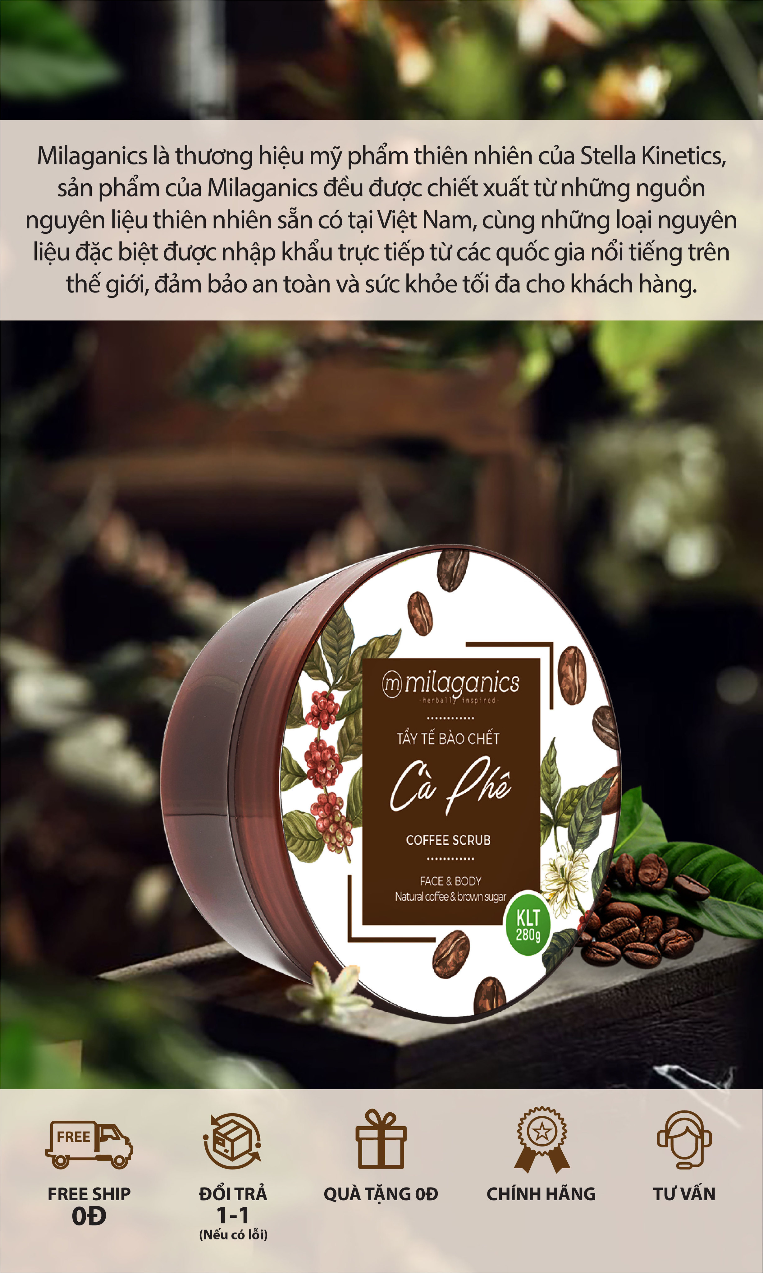 Scrub tẩy tế bào chết cà phê Milaganics không chứa chất bảo quản, không cồn hoàn toàn lành tính phù hợp với mọi làn da dù là nhạy cảm hay dễ bị kích ứng.